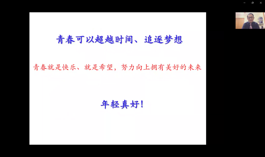 李老师首先以“年轻真好(BEING YOUNG IS SO GREAT)”作为开场词,寄语参与会议的上千名高中生“青春可以超越时间,超越梦想”,放宽视野、通过自身的努力积极向上,努力拥有美好的未来。
