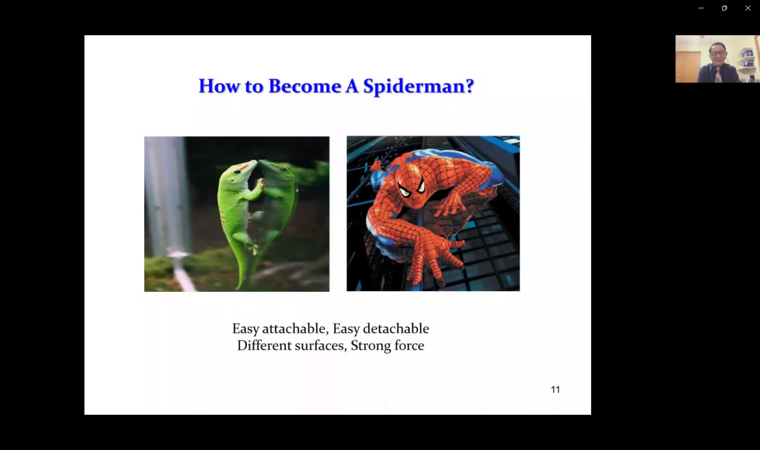 他以“向日葵为什么总是面朝太阳”、“树叶为什么大部分是绿色的”、“含羞草的叶片受到刺激会收缩”、“壁虎和蜘蛛侠为什么能够吸在墙壁上”以及“沙漠中的蚂蚁为什么还能保持较低的温度”等自然界常见但又神秘的现象为引,对智能材料进行详细的介绍。这种能够感知外部刺激、判断并适当处理且本身可执行的新型功能材料,将支撑未来高技术的发展。并借此鼓励同学们多多关注自然,从自然界的奇妙与完美中收获灵感,同学们为神奇的自然科学现象所吸引。