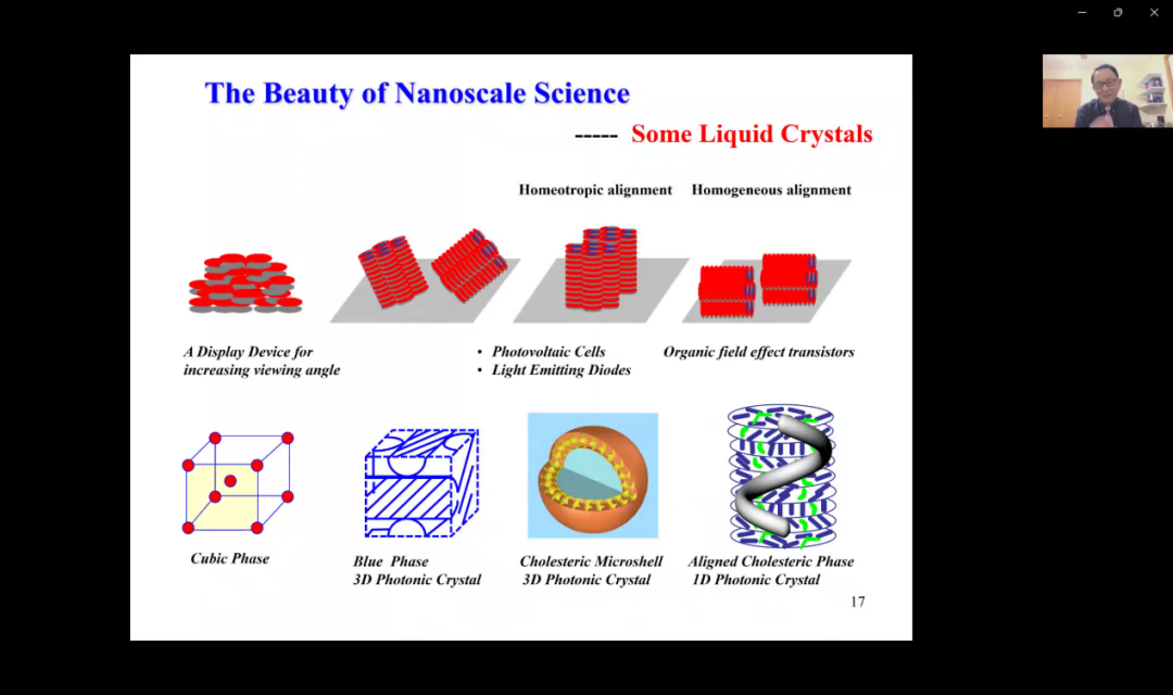 随后李老师对已走入千家万户的 “液晶”一词进行了简明扼要的阐释,帮助大家对液晶材料建立初步的认识,并介绍近些年团队在智能液晶材料方面的研究成果与最新研究进展,展现了纳米科学之美(The Beauty of Nanoscale Science)。