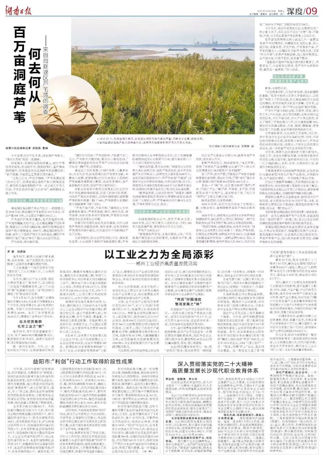 “巴陵三江口,芦荻齐如麻。”芦苇是洞庭湖“湿地之宝”。自洞庭湖区造纸产能大规模退出后,原本作为造纸原料的芦苇一夜之间几乎无人问津,不仅其经济价值“大打折扣”,新的隐患也随之而来。