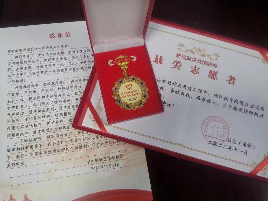 会上,社区负责人向全体志愿者致辞,充分肯定了大家在疫情防控工作中发挥的作用,对大家的辛勤付出和对疫情防控工作的大力支持表示衷心的感谢,并向志愿者颁发抗疫纪念章及志愿者证书、感谢信。