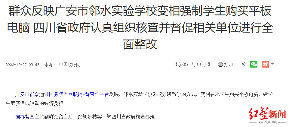 日前,有四川省广安市群众通过国务院“互联网+督查”平台反映,广安邻水实验学校采取分班教学的方式,变相要求学生购买平板电脑,给学生家庭造成较重的经济负担。12月28日,红星新闻从中国政府网获悉,国办督查室收到群众留言后,经初步核实,转四川省政府核查办理。四川省政府接到国办督查室转送的问题线索后,责成四川省教育厅和广安市政府组织开展核查。