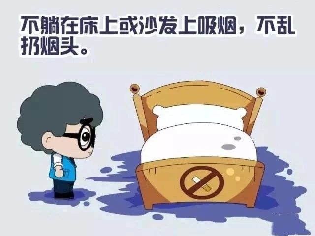 二、不要在床上或者沙发上吸烟,未熄灭的火柴、烟头以及烟灰一旦掉落在被褥、衣服或沙发上,极易引起火灾。