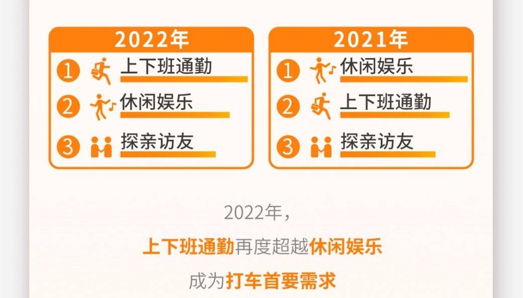 受疫情影响,2020年,通勤超过休闲娱乐成为首要的打车需求。2021年,休闲娱乐需求重新回归第一位。报告显示,2022年,在诸多出行需求里,上下班通勤、休闲娱乐、探亲访友排在前三位。具体来看,12月通勤订单占比最高。