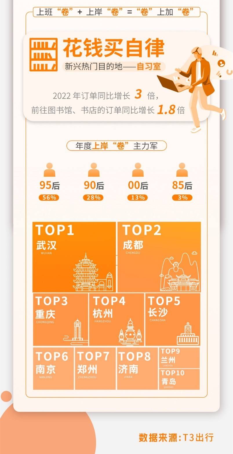 去付费自习室“花钱买自律”热了起来。报告显示,2022年,前往付费自习室的订单同比增长3倍,前往图书馆、书店的订单也同比增长1.8倍。从年龄段分布来看,95后以56%的占比排在第一位;其次是90后,占比为28%;00后位居第三位,占比为13%;85后占比最低,为3%。