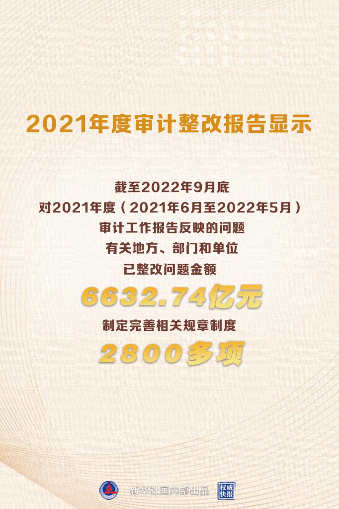 2021年度审计工作报告于2022年6月公布,其反映的6639个问题及提出的建议已全部纳入此次整改范围。本次审计整改报告指出,截至2022年9月底,96%要求立行立改的问题已整改到位,比上年提高1个百分点,78%要求分阶段整改的问题已完成整改,要求持续整改的问题均制定了措施和计划。