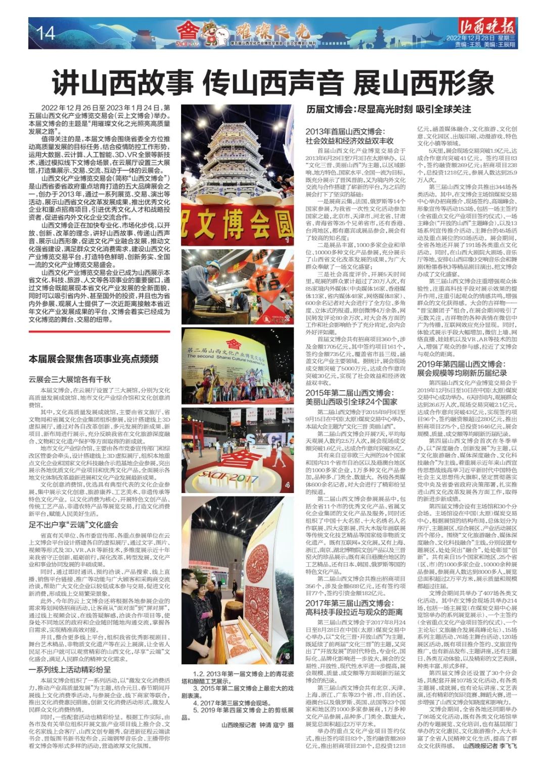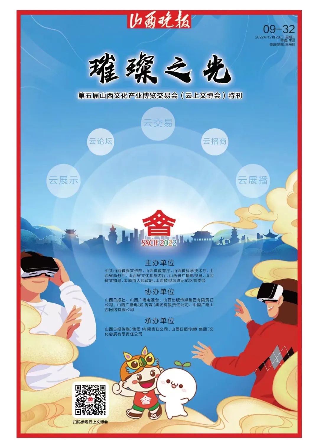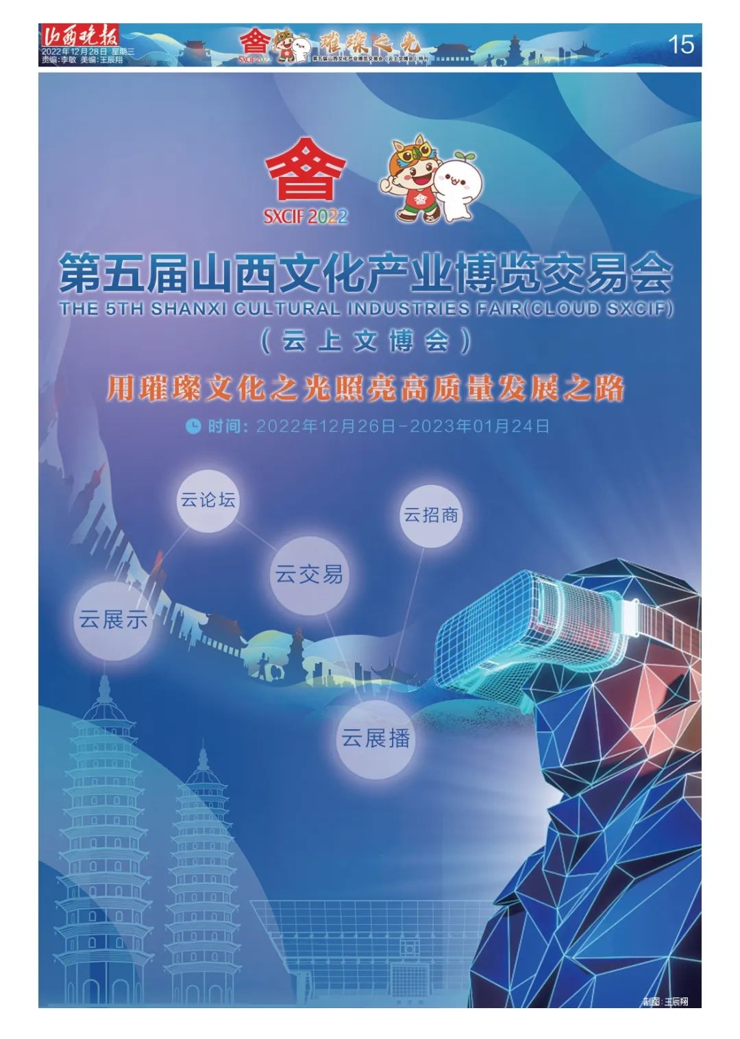 2022年12月26日至2023年1月24日,第五届山西文化产业博览交易会(云上文博会)举办。本届文博会的主题是“用璀璨文化之光照亮高质量发展之路”。