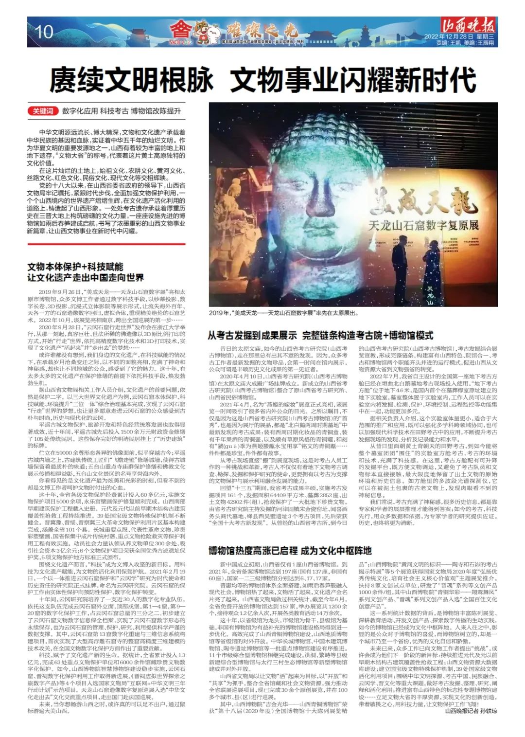 中华文明源远流长、博大精深,文物和文化遗产承载着中华民族的基因和血脉,实证着中华五千年的灿烂文明。作为华夏文明的重要发源地之一,山西有着较为丰富的地上和地下遗存,“文物大省”的称号,代表着这片黄土高原独特的文化价值。