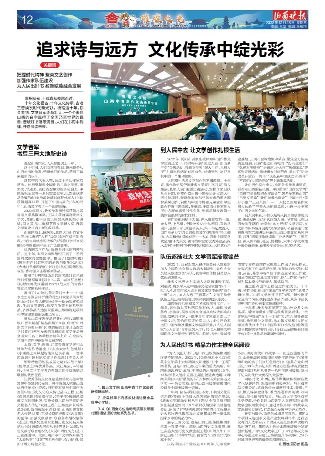 十年文化强省,十年文化传承,古老三晋焕发时代新光彩。梳理这十年,你会看到,文学晋军逐渐壮大,一个个来自山西的名字赢得了全国乃至世界的瞩目;晋版好书琳琅满目,人们在书海中徜徉,开卷展读未来。