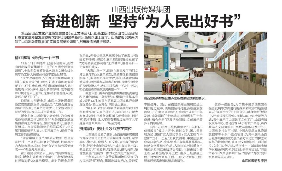第五届山西文化产业博览交易会(云上文博会)上,山西出版传媒集团与山西日报社在文化高质量发展成就馆共同组织筹备新闻出版展区线上展厅。山西晚报记者采访到了山西出版传媒集团“文博会展览协调组”,对布展情况进行探访。