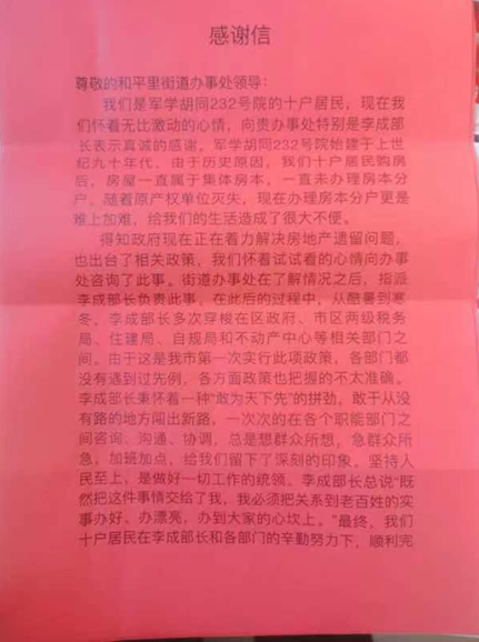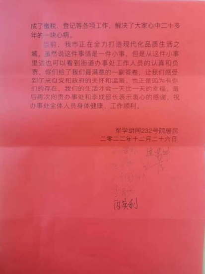 “真的很感谢你们,住了20多年的房子终于完成了缴税、登记等各项工作,解决了大家心中20多年的一块心病。”12月27日,莲池区军学胡同232号院3位居民一起为莲池区和平里街道送来了锦旗和感谢信,代表家属院所有居民感谢街道想群众所想,急群众所急,加班加点,为他们解决了历史遗留问题。