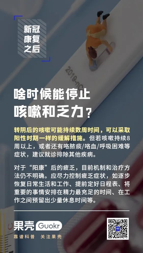 转阴之后,感觉要把肺都要咳出来了,多走几步路也累得慌。什么时候能停止咳嗽和乏力呢?