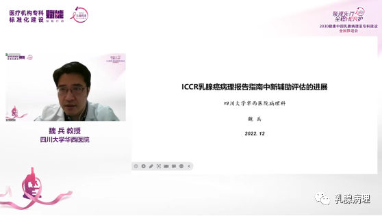 四川大学华西医院魏兵教授首先带来“ICCR乳腺癌病理报告指南中新辅助评估的进展”主题报告,魏兵教授详细解读了国际癌症报告协作组(ICCR)报告指南中相对2019年版的更新要点内容,主要包括:选择病理评估系统,尤其是RCB系统,要注意细节问题,如对于病理评估报告模板中的重点内容向患者进行详细解释;对于瘤床残余黏液应准确定位、充分取材;纤维化瘤床出现在阴性切缘的重要性目前尚不清楚,此时通常无需再进行切除;新辅助内分泌治疗后的病理评估包括肿块大小、淋巴结状态、KI-67水平、ER状态等。