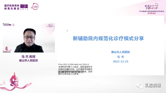 唐山市人民医院马杰教授随后分享了“新辅助院内规范化诊疗模式分享”主题报告,马杰教授表示,新辅助治疗是早期乳腺癌全程管理的重要组成部分,既服务于手术更服务于长期生存获益。马杰教授详细分享了唐山市人民医院新辅助院内规范诊疗模式,提出新辅助活检标本快速出免疫组化结果对临床很重要,为此和病理科一起沟通协作,开通了穿刺标本诊断和免疫组化加急通道,3-4个工作日能出结果。马杰教授谈到新辅助诊疗流程管理特别需要临床病理的紧密合作,病理科对新辅助的认知了解、规范化的病理评估,能为乳腺癌患者的精准诊疗保驾护航。