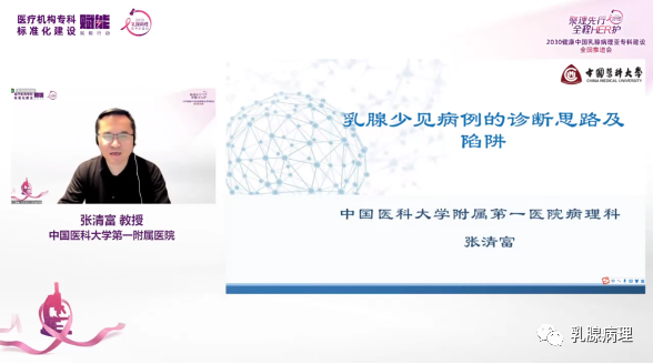 中国医科大学第一附属医院张清富教授在少见乳腺疾病的诊断上有着非常丰富的经验,通过多个临床案例分享了“乳腺少见病例的诊断思路及陷阱”主题报告。张清富教授认为诊断首先要见微知著-注意对细节的把握,例如乳腺鳞癌和腺鳞癌虽然都是浸润生长、促结缔组织增生间质、细胞内角化,但低级别腺鳞癌细胞温和、条索不规则,呈蝌蚪样、Ki-67低。其次要归纳总结-注意对知识的整合,不同来源的细胞在形态上各有其特点,掌握这种特点有助于临床诊断。另外,还应去伪存真-学会透过现象看本质,有时结合免疫组化结果可辅助诊断,排除干扰项,避免被假象所蒙蔽。
