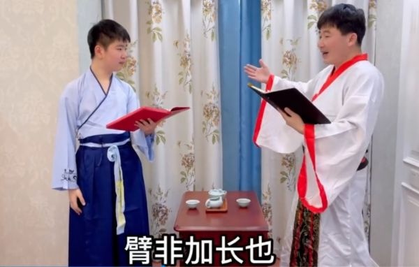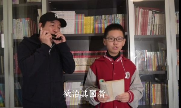 一家三口共读《朱子治家格言》;儿子背诵《大学》,父亲口琴配乐;奶奶弹钢琴,为孙女国学大赛助力;父子身着汉服展示茶艺……