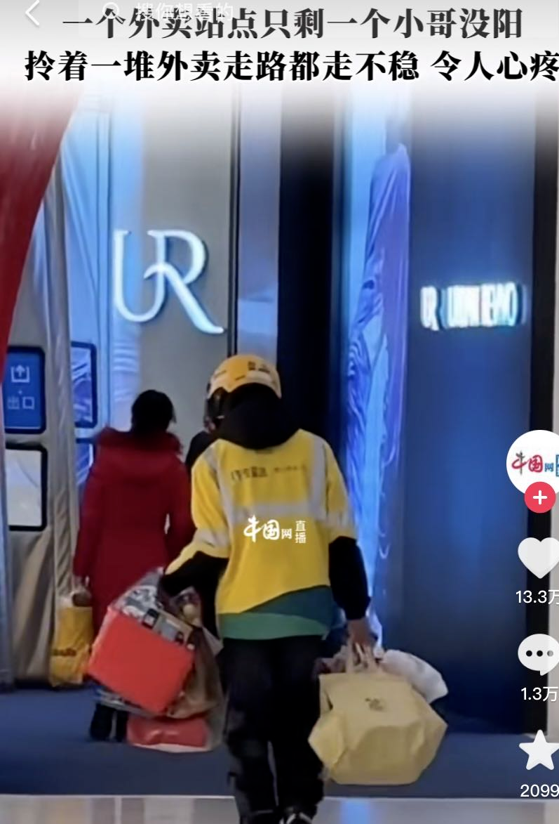一位外卖小哥,手里提着满满当当的餐盒,踉踉跄跄地往商场赶。