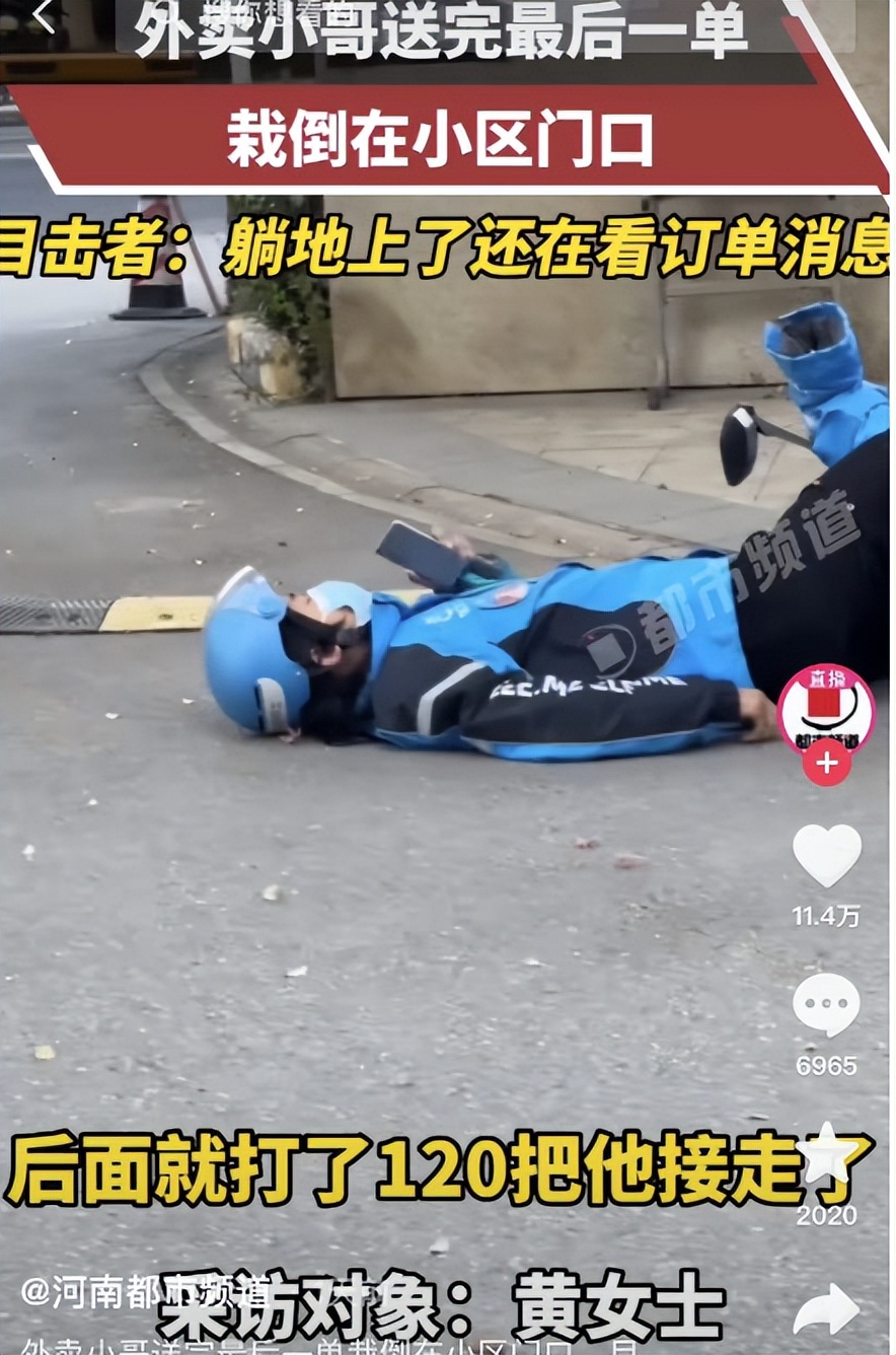 送完最后一单后,体力不支的他栽倒在小区门口,人都瘫在地上了,眼睛还在盯着手机上的外卖订单。