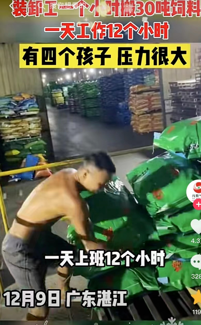 他手脚麻利地不停装货卸货,一个小时要搬30吨饲料,每天要超负荷工作12个小时。