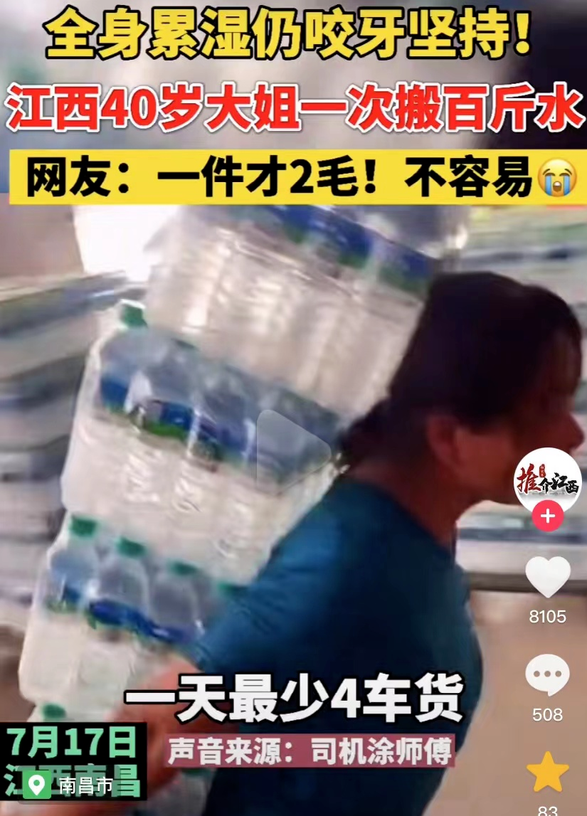 你看这位背着成箱矿泉水健步如飞的大姐。
