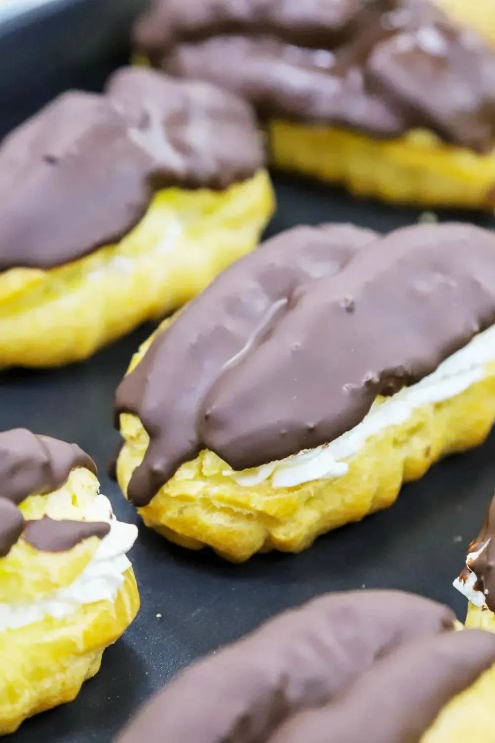 “哈斗”就更有意思了:脆脆的空心酥皮,注入香甜的奶油,表面是一层硬硬的巧克力,有时候还会嵌几片杏仁,吃起来甜、韧、滑,又滋润,又绵密——是不是跟闪电泡芙长得挺像?可“哈斗”这个名字与闪电泡芙的法语原名Éclairs毫无关系,倒很像是Hotdog(热狗)的音译。仔细想来,哈斗与热狗在外观上确有相似之处,倒不晓得是哪位前辈给这法国甜心取个美国名字,还把造型变得胖墩墩的。