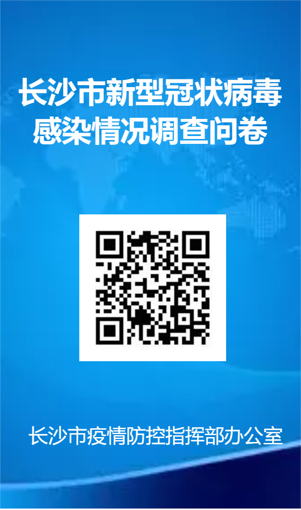 为进一步评估长沙市居民新冠病毒感染情况,长沙市疫情防控指挥部办公室邀请您做个快速问卷调查。所有结果仅作统计分析之用,不涉及个人隐私情况。您的参与将对我们下一步防控工作发挥重要参考作用,感谢大家支持并请积极转发!