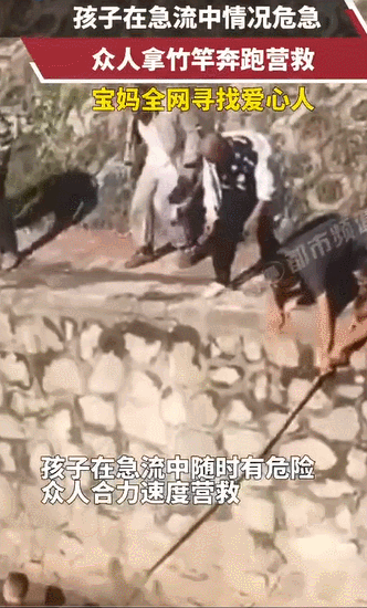 陕西西安,一男孩掉进水渠被急流冲走,一名男子跳进水里拉住孩子,但因水流湍急难以站立,众人拿竹竿奔跑营救,孩子最终被安全救上岸。