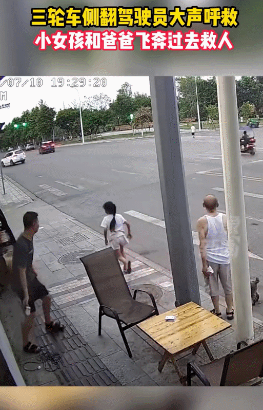 四川德阳,一辆三轮车转弯时侧翻,驾驶员大声呼救,马路对面的父女俩飞奔救人。小女孩没有一丝犹豫奔跑的样子太帅了!