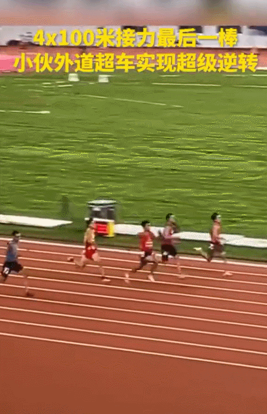 在安徽省第十五届运动会4X100米接力赛中,小伙在最后一棒实现逆转,全场沸腾!