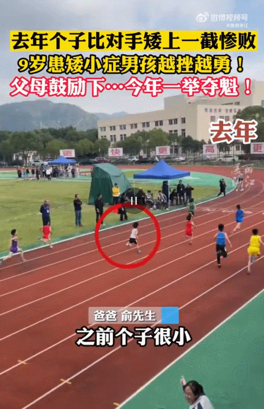 浙江宁波,在学校运动会上,9岁患有矮小症的男孩俞佳池夺得百米比赛第一名。男孩爸爸俞先生说,因为儿子患有矮小症,父母想让他个子能够赶上同龄人,所以一直鼓励他要多运动,男孩自己很要强,训练刻苦专注。去年还被对手远远甩在身后,今年就拿到第一。