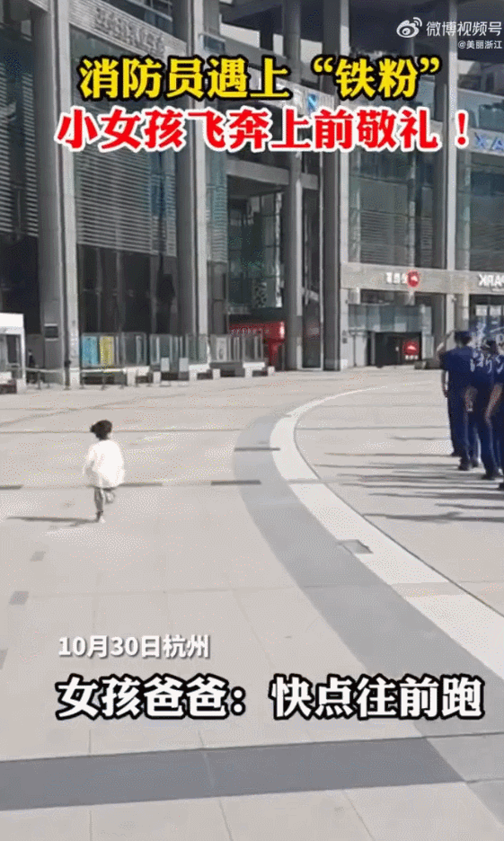 浙江杭州,一位小女孩和爸爸逛街时偶遇穿着制服的消防员,小女孩跑向这些消防员,向他们敬礼。