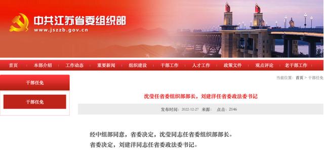 12月27日,江苏省委组织部官网发布消息:经中组部同意,省委决定,沈莹任省委组织部部长。省委决定,刘建洋任省委政法委书记。