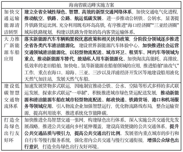 《海南省碳达峰实施方案》提出在能源结构清洁低碳化、产业结构优质现代化、交通运输结构去油化、城乡建筑低能耗化,海洋和森林碳汇贡献、低碳技术推广应用、低碳政策体系制度集成创新等方面,加快形成一批标志性成果,走在全国前列,争做碳达峰碳中和工作“优等生”,在国际应对气候变化交流中展示出海南靓丽名片。