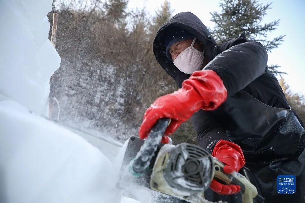 12月26日,在甘肃省渭源县天井峡(渭河东源)景区,工作人员在制作雪雕。新华社记者 马希平 摄
