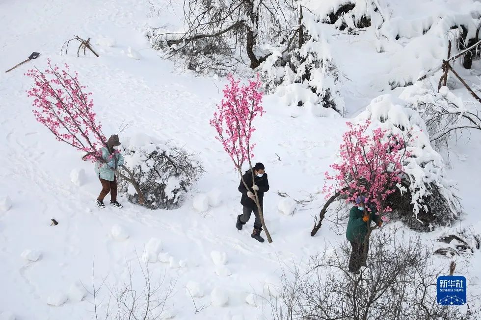 12月26日,在甘肃省渭源县天井峡(渭河东源)景区,工作人员搬运雪景装饰品。新华社记者 马希平 摄
