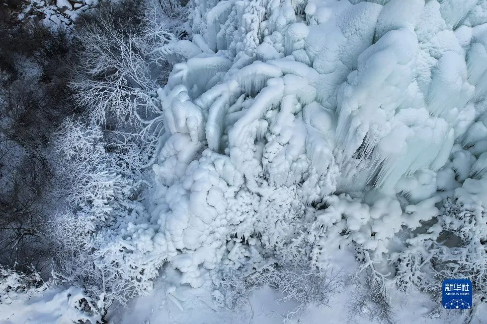 这是12月26日在甘肃省渭源县天井峡(渭河东源)景区拍摄的冰瀑和雪雕景观(无人机照片)。新华社记者 马希平 摄