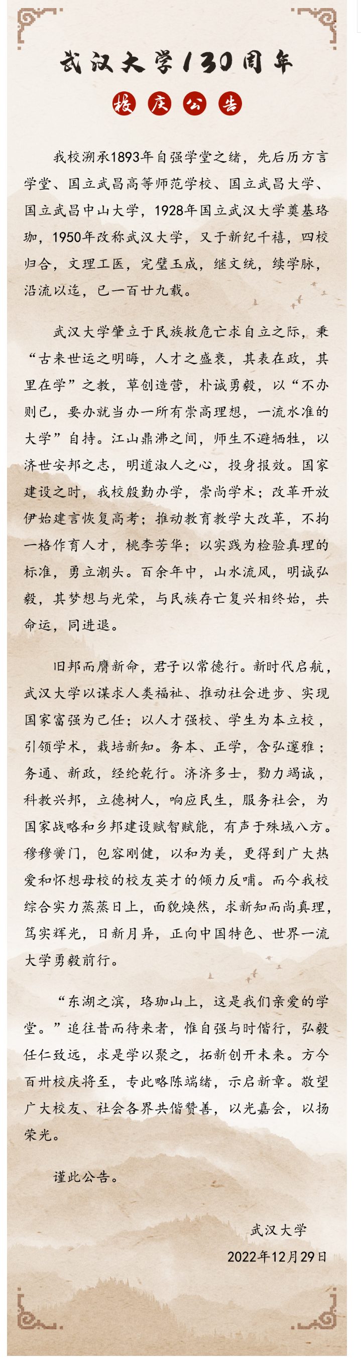 武汉大学130周年校庆公告