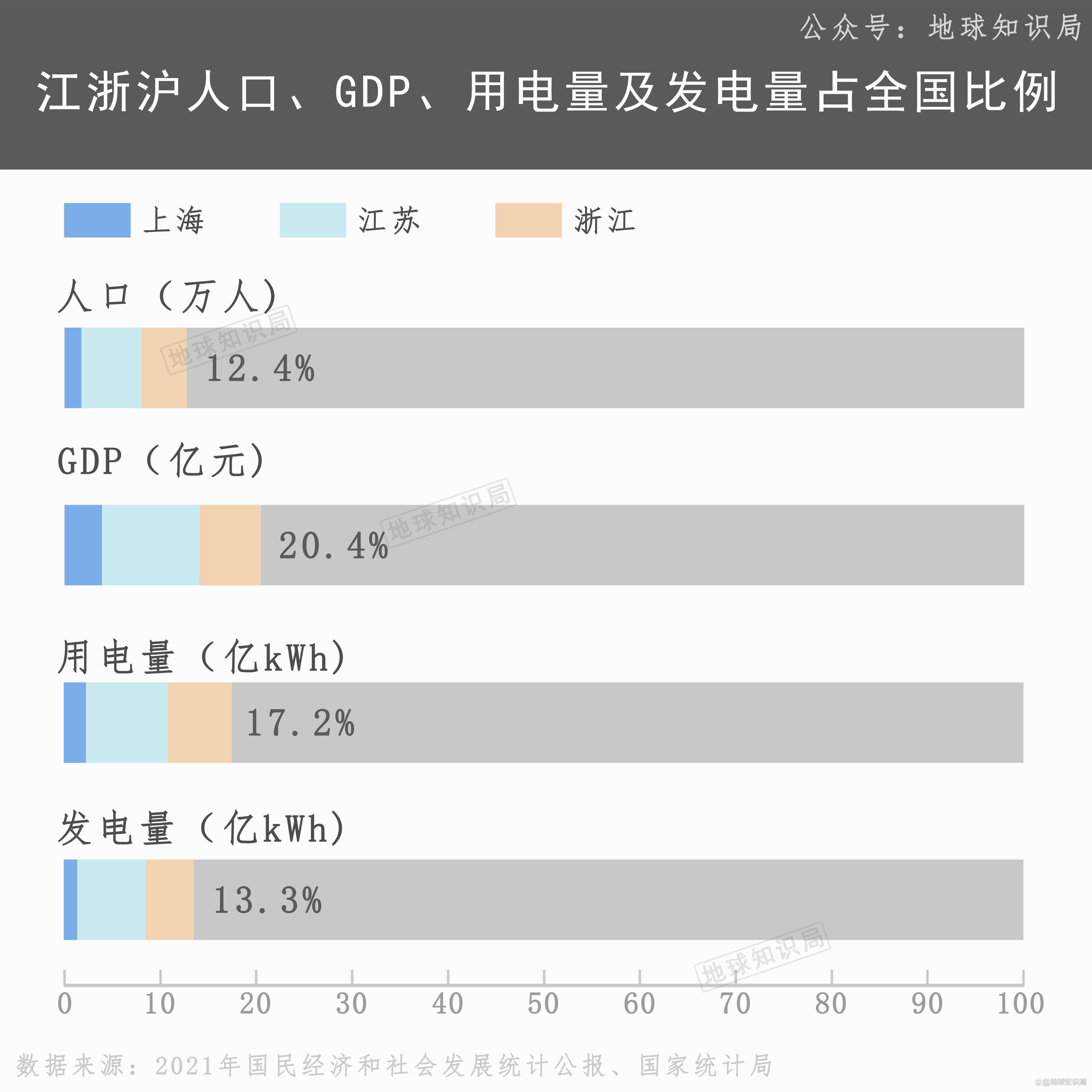 西部地区有着潜力巨大的清洁能源,但我们大部分的人口、经济发达城市、产业都在东部。这意味着东部很多经济重镇都无法能源自给。以江浙沪三地为例,该地区囊括了中国12.4%的人口和20.4%的GDP,2021年的用电量高达14365亿千瓦时,但发电量只有11194亿千瓦时,近四分之一的缺口全靠区域外调入。