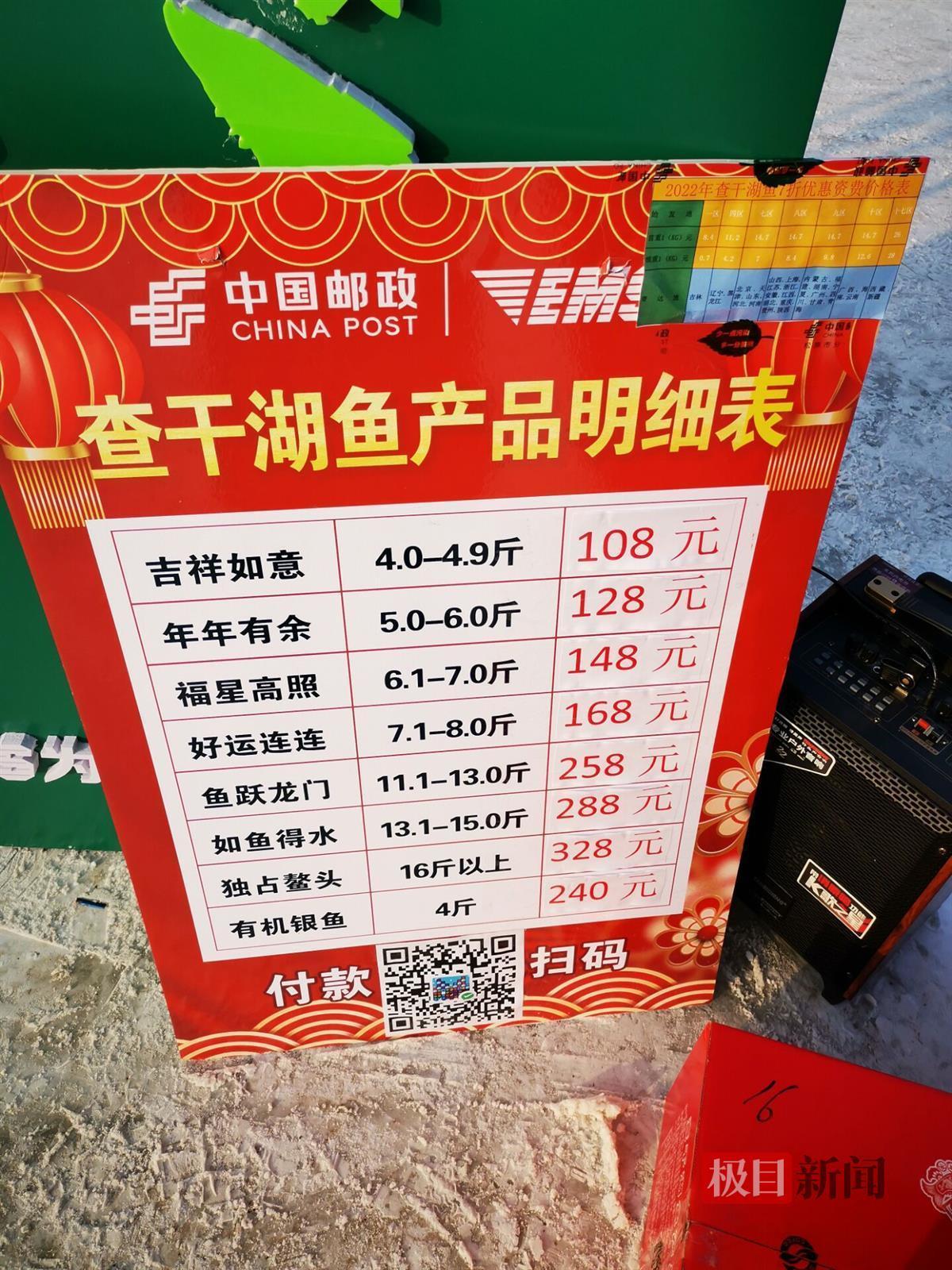 活动现场,中国邮政的工作人员售卖查干湖鱼获礼盒,并提供精美包装和快递到家服务。在现场展示的销售明细表上,查干湖冬捕鱼的售价按照重量区分售价。其中,4斤到4.9斤的一条鱼售价108元,16斤以上的鱼一条售价为328元。