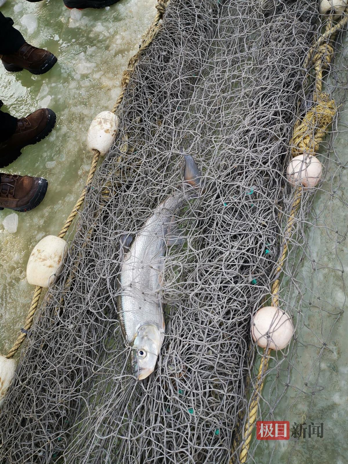 极目新闻记者现场见证渔工们用马拉绞盘、冰下走网等传统方式,凿开约半米厚的冰层,使用约2公里长的渔网围捕冰面下的鱼群,与游客们分享丰收的喜悦。