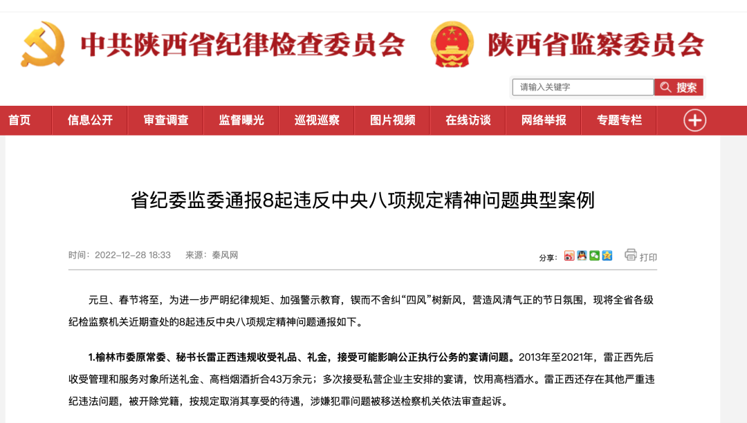 1.榆林市委原常委、秘书长雷正西违规收受礼品、礼金,接受可能影响公正执行公务的宴请问题。2013年至2021年,雷正西先后收受管理和服务对象所送礼金、高档烟酒折合43万余元;多次接受私营企业主安排的宴请,饮用高档酒水。雷正西还存在其他严重违纪违法问题,被开除党籍,按规定取消其享受的待遇,涉嫌犯罪问题被移送检察机关依法审查起诉。