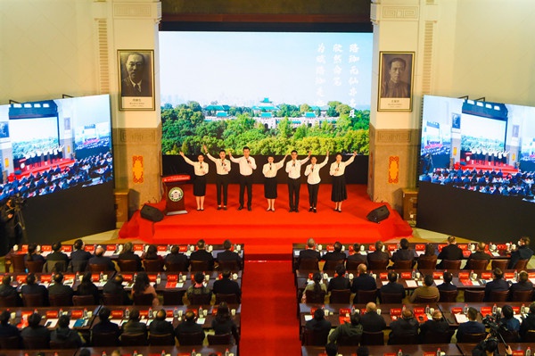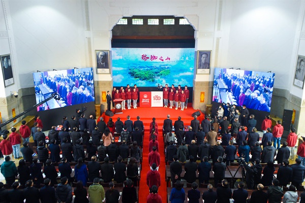武汉大学130周年校庆启动仪式,现场师生合唱校歌。