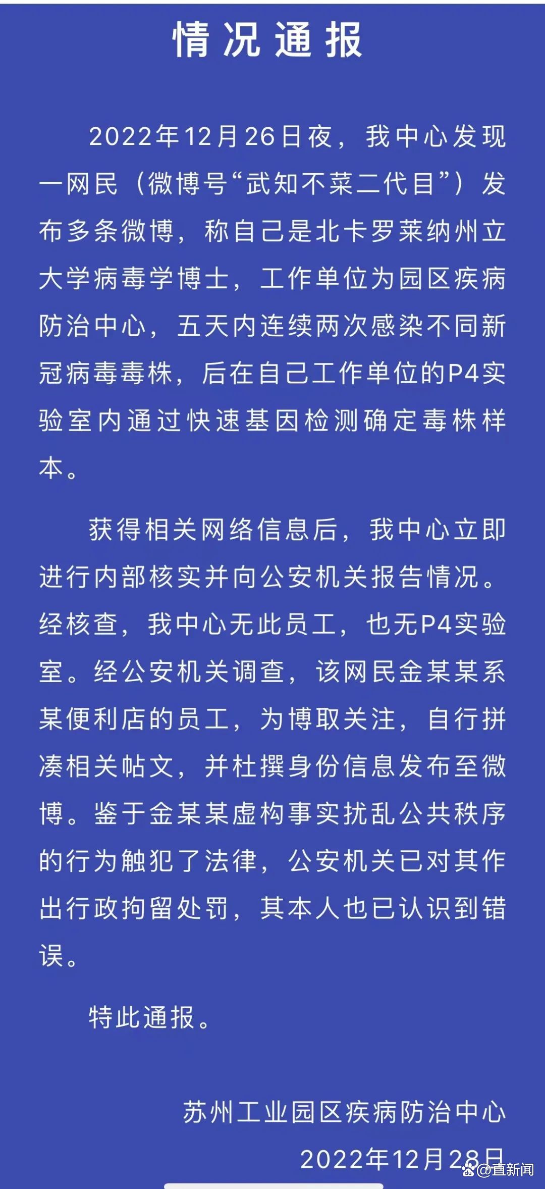 获得相关网络信息后,园区疾病防治中心立即进行内部核实并向公安机关报告情况。经核查,苏州工业园区疾病防治中心无此员工,也无P4实验室。经公安机关调查,该网民金某某系某便利店的员工,为博取关注,自行拼凑相关帖文,并杜撰身份信息发布至微博。鉴于金某某虚构事实扰乱公共秩序的行为触犯了法律,公安机关已对其作出行政拘留处罚,其本人也已认识到错误。