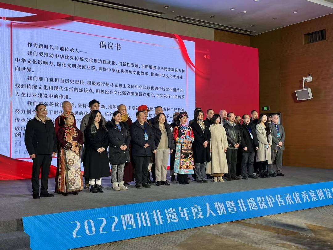 12月29日,由四川省文化和旅游厅主办的“璀璨非遗 永续传承——2022四川非遗年度人物暨非遗保护传承优秀案例发布仪式”在成都举行。活动现场揭晓了2022年十位非遗年度人物以及四大类别的非遗保护传承优秀案例。