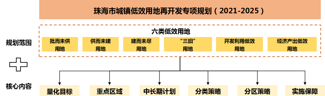 国土空间总体规划将实施城市更新行动融入城市发展战略,通过规划统筹城市总体发展格局,明确城市更新总体目标和重点区域,提出“东部中心城区侧重以城市更新推动存量资源的盘活利用,重点完善公共服务设施和提升环境品质,西部城区侧重以土地整备推动新城开发和重点产业园区建设,提升西区建设水平和实现产城融合”的战略性、综合性安排部署。市级城镇低效用地再开发专项规划按照国土空间总体规划确定的总体目标和重点区域,进一步细化确定规划期末、远期目标任务及中长期计划,明确老旧小区、旧厂房、城中旧村、烂尾楼“留改拆”理念及原则,形成分区分期规划实施策略。不同于其他城市做法的是,珠海将“三旧”用地与批而未供、供而未建、建而未尽、开发利用低效、经济产出低效用地各类存量土地资源统筹进行规划研究,从整合盘活存量资源的角度谋划城市更新规划策略及路径,处理好各类用地之间的协同关系,编制形成市级城镇低效用地再开发专项规划。