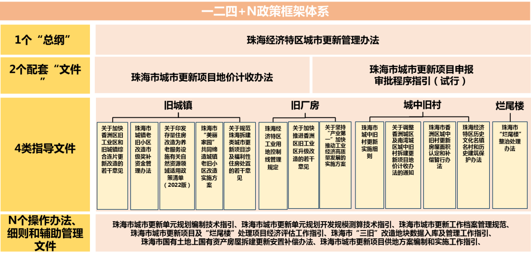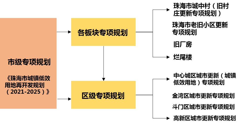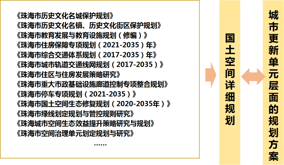 在中观层面,珠海围绕市级专项规划确定的目标任务及计划、更新理念及原则、分区分期规划实施策略,通过深化编制各板块城市更新专项规划,细化规划期内老旧小区、旧厂房、城中旧村、烂尾楼“留改拆”具体目标指标、主要任务和计划安排,并给予相应的政策支持以保障规划落地。