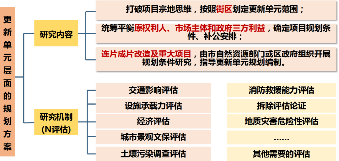 在微观层面,珠海创新建立了以城市更新单元为基础的“一规划N评估”规划研究机制,即传导落实国土空间详细规划强制性内容要求来编制更新单元规划方案,开展交通影响、设施承载力、经济、城市景观、文保和土壤污染调查状况等评估。以城市更新单元打破项目宗地思维,强调单元管理、实施片区更新,按照街区划定更新单元范围,并通过统筹平衡原权利人、市场主体和政府三方利益,确定项目规划条件及补公安排(指向政府无偿移交部分用地用于建设公益性项目或配建公共服务设施,下同),提出规划用地布局、指标设置、建筑设计概念方案。城市更新单元层面的规划方案重点从以下两方面落实规划传导:一是对国土空间详细规划的传导落实,确保详细规划中确定的城市基础设施、公共服务设施、公共绿地等强制性内容安排落实,如幼儿园、中小学的位置和规模等。二是通过“N评估”确保与各级上位规划及相关专项规划的衔接传导。如在城市更新单元层面规划方案中同步开展城市景观和文化保护专题研究,完善历史文化资源调查评估,对涉及具有保护价值老建筑的改造项目,必须因地制宜制定保护与利用方案后方可进一步推进。