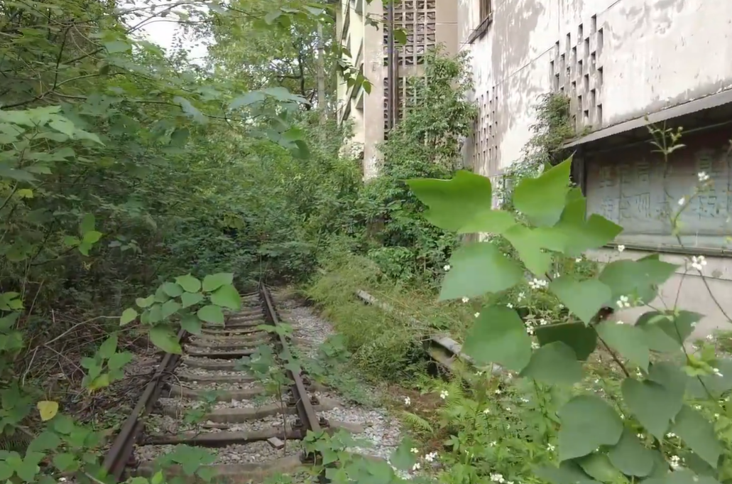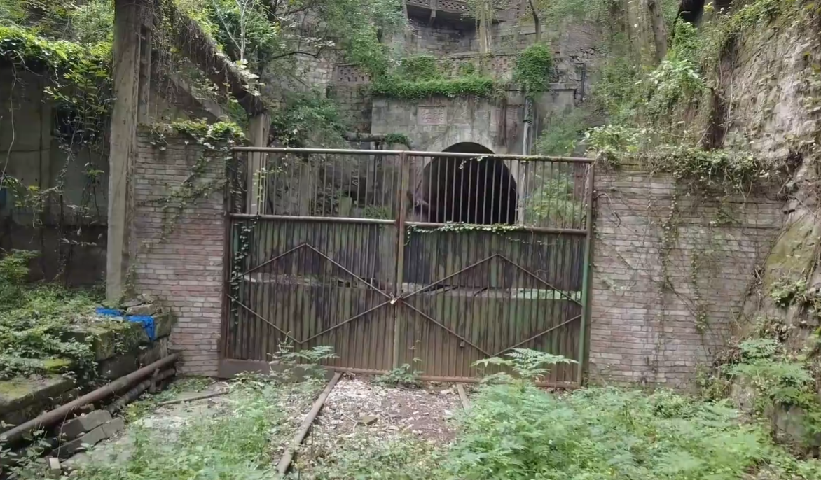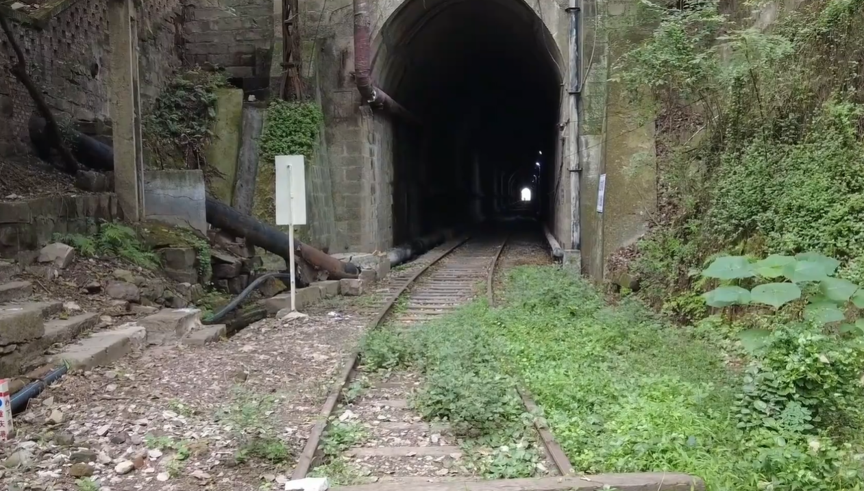 厂区里的很多建筑已经慢慢变得残破,曾经的小火车铁轨,也是经经停停的,有的路段早已经被荒草和树枝所掩盖,有的路段则已经磨的失去了棱角,还有一节被锁在了铁门之中,远处就是一条深深的隧道,铁轨伸向隧道之中,曾经这里可是物资进进出出的必经之路呢!
