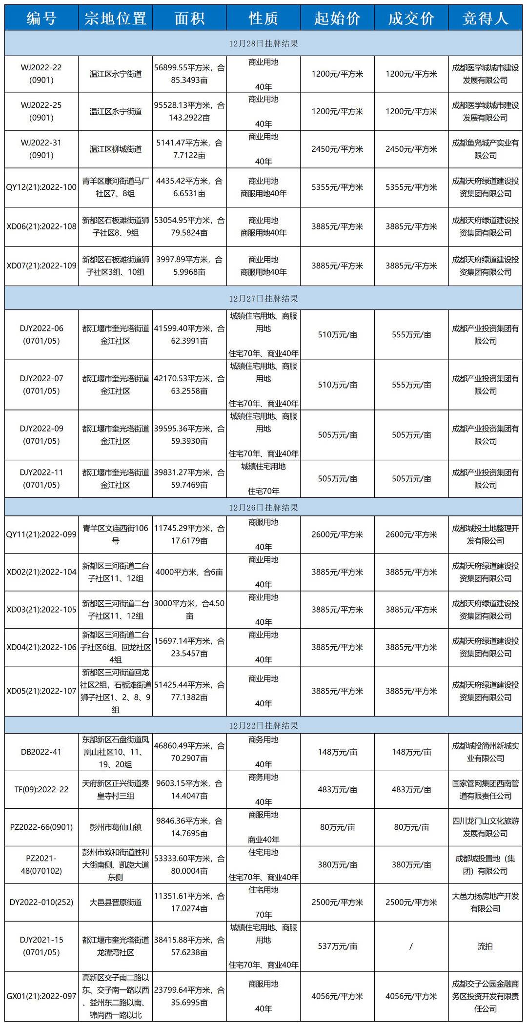 据成都公共资源交易中心网站,12月22日-12月28日,共有22宗非工业用地通过挂牌或拍卖形式交易,一宗土地流拍。其中纯住宅用地仅一宗,位于都江堰市奎光塔街道金江社区,合59.7469亩,由成都产业投资集团有限公司竞得。
