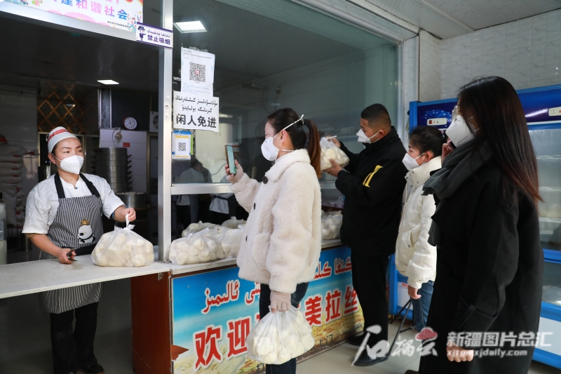 12月28日,冒着热气的馍馍出笼后,新和县美拉丝馒头店前排队的人多起来。在后堂忙着蒸馍馍的阿不力米提·艾买尔不时走到窗口,和老顾客们寒暄几句。